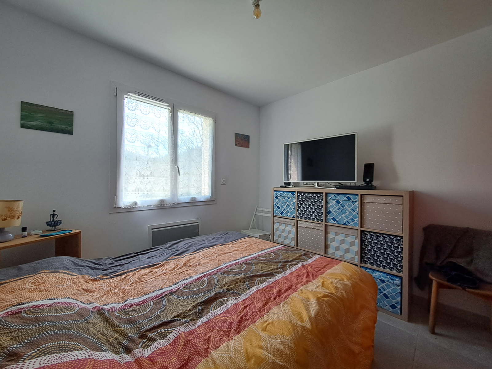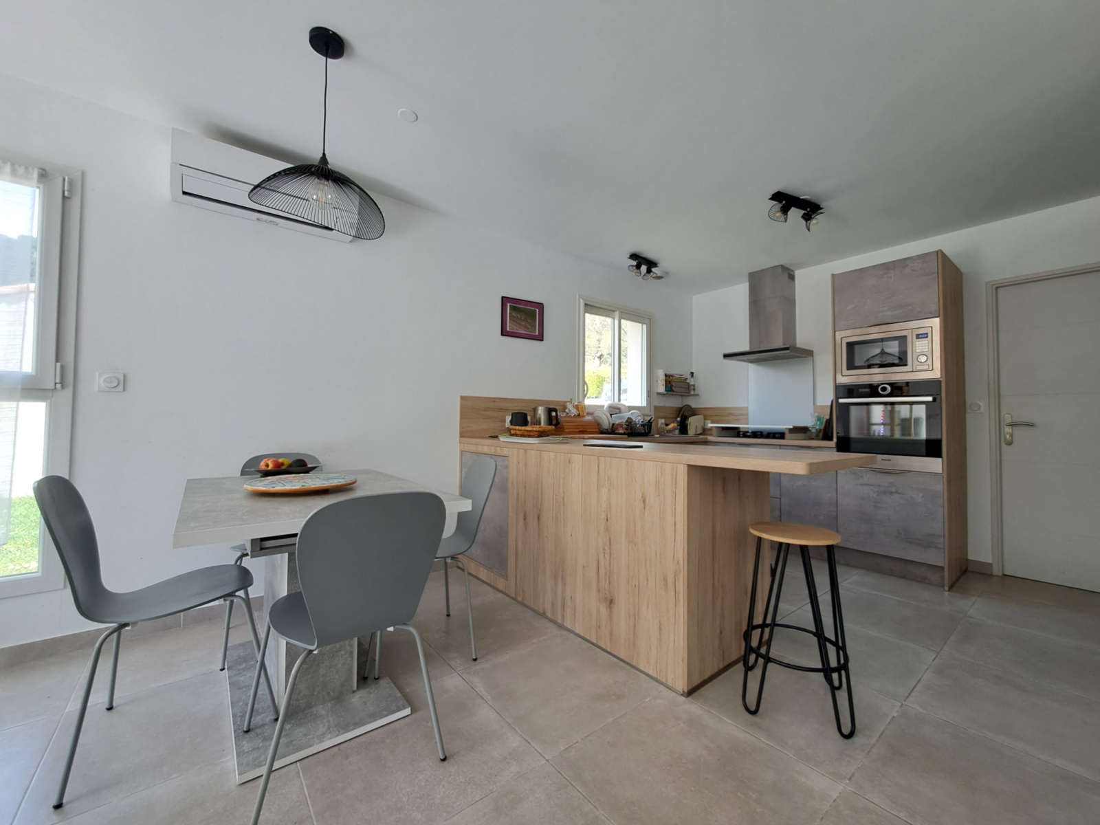 D’une surface d’environ 70 m², elle propose une pièce de vie baignée de lumière avec séjour et cuisine ouverte, une chambre, une salle d’eau ainsi qu’un WC indépendant. Un cellier complète les espaces intérieurs, apportant un rangement pratique au quotidien.