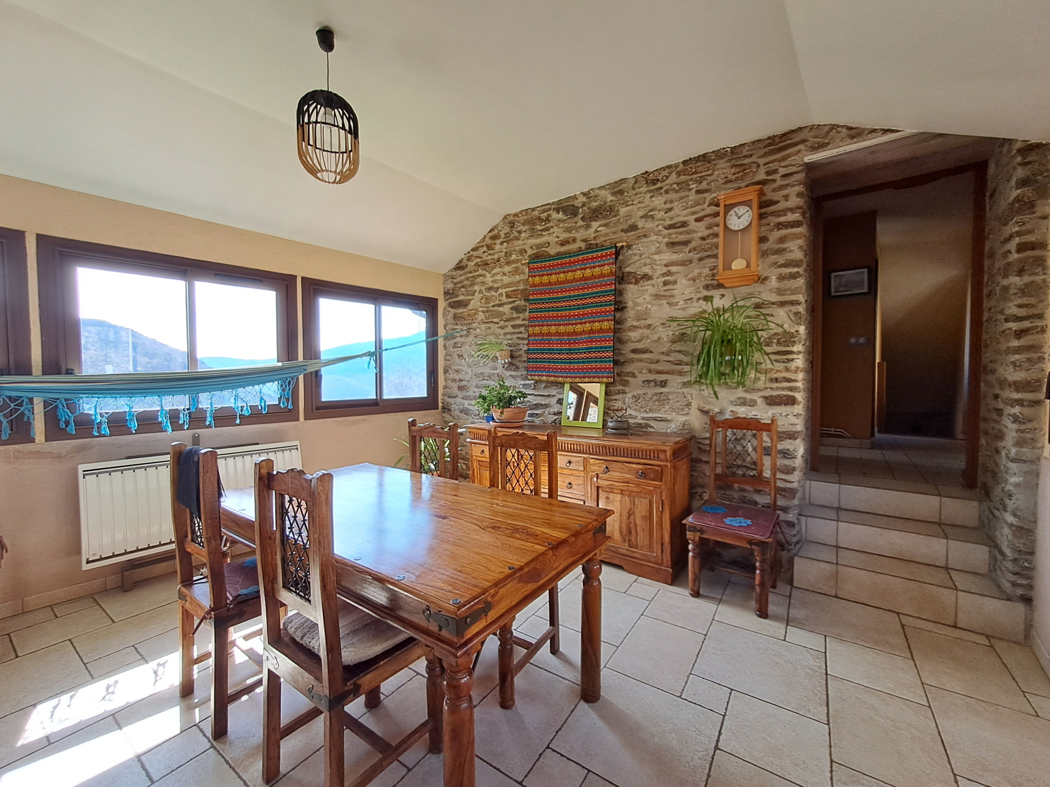 Vous pourrez profiter de beaux espaces extérieurs, un côté entièrement dallé avec les pierres du pays et un côté jardin arboré avec possibilité de potager. Le plus : une source commune, vous offrira un droit d'iirigation.